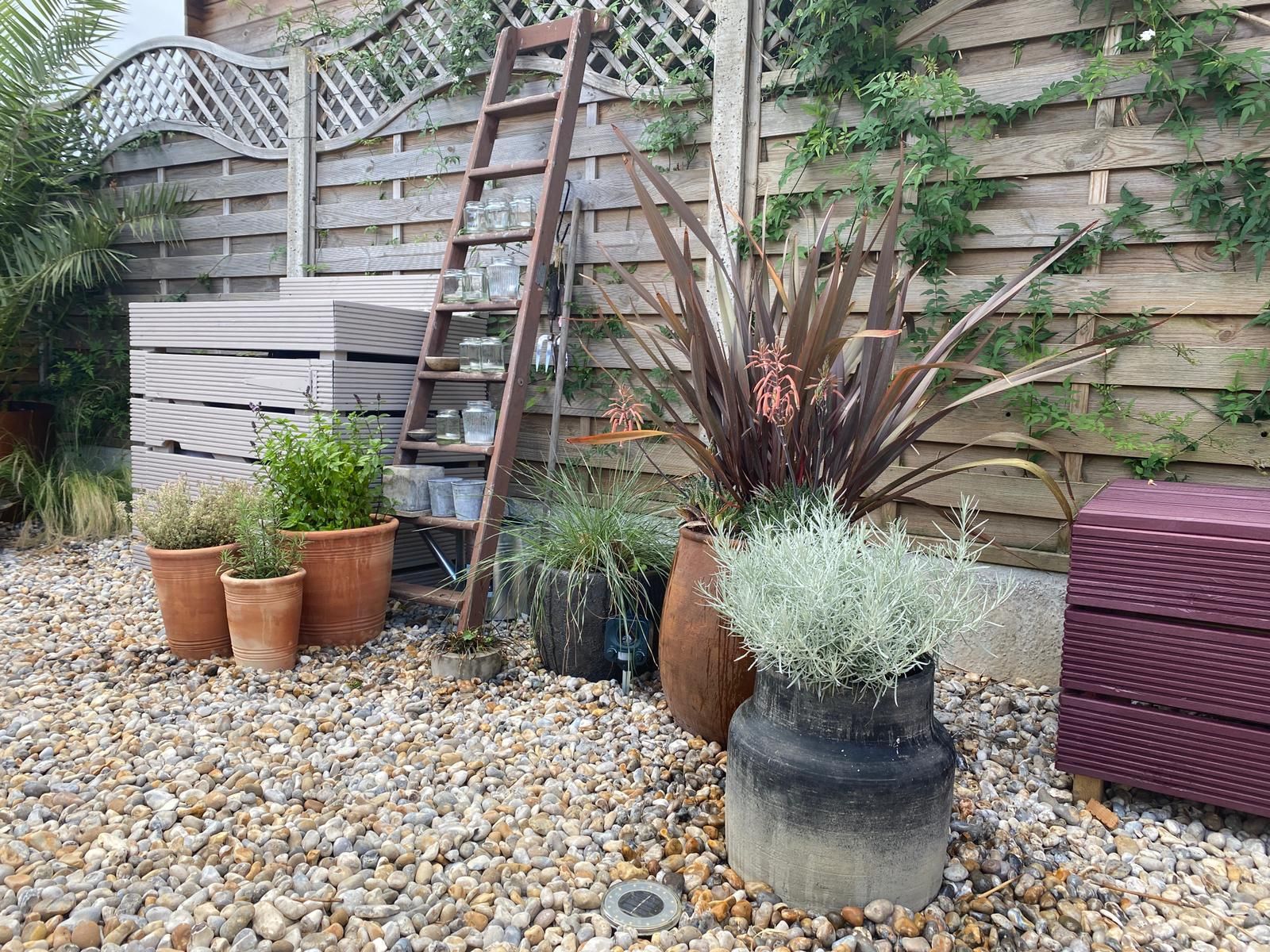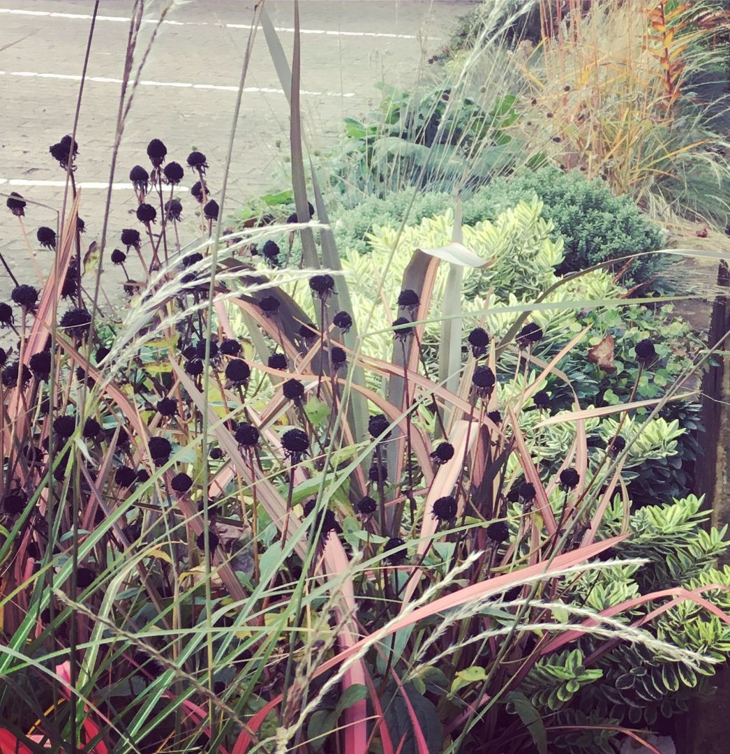 Using a sparing pallet of greens, browns and greys, as per the owner's instructions, I combined planting into pots with planting straight into the ground. The use of pots allowed for some of the more tender plants to be moved for winter protection.