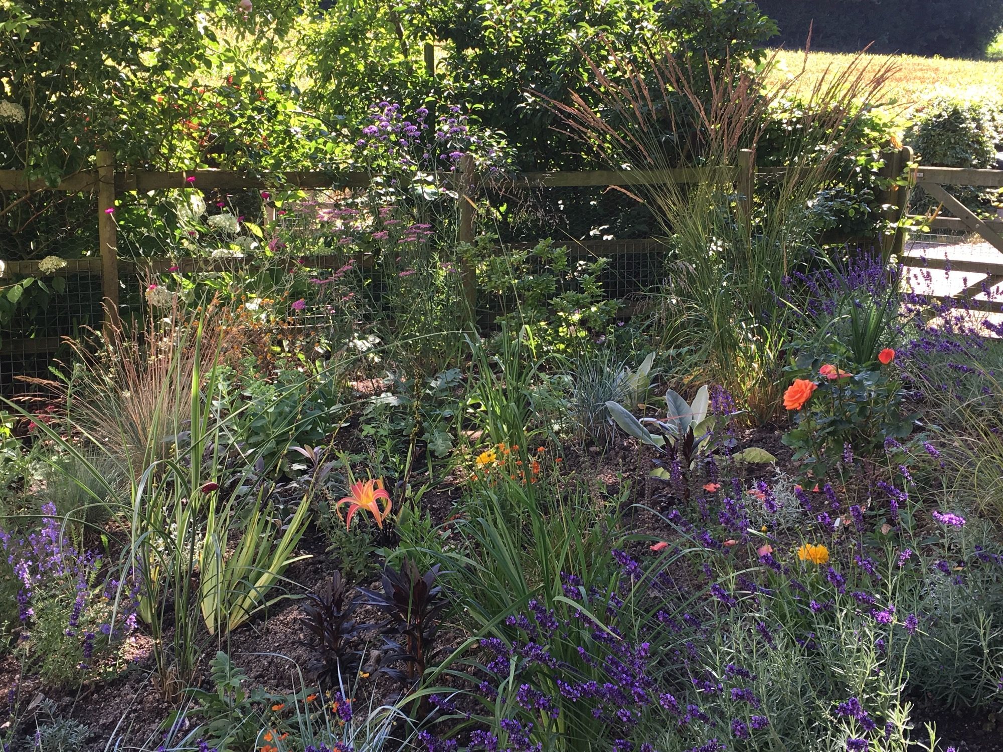 Ornamental grasses catch the low angled light, while verbena, eupatorium, roses and asters provide year-long interest and an array of seedheads, which accompany the golden grasses beautifully, long into the winter. Care was taken to choose plant species that would thrive on the existing shady clay soil, naturally fertilised by hens.